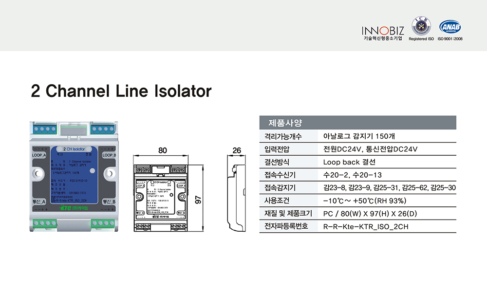 2채널 라인 아이소레이터/케이텔/아날로그감지기150개/80(W)*97(H)*26(D)/식