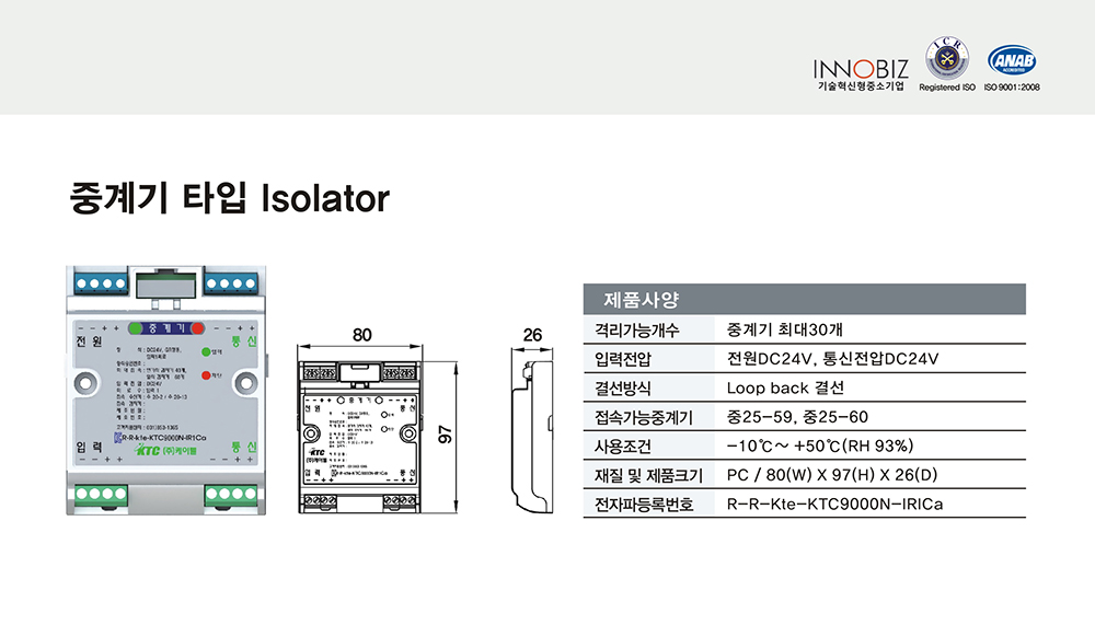 중계기타입 아이소레이터/케이텔/중계기 최대 30개/80(W)*97(H)*26(D)/식