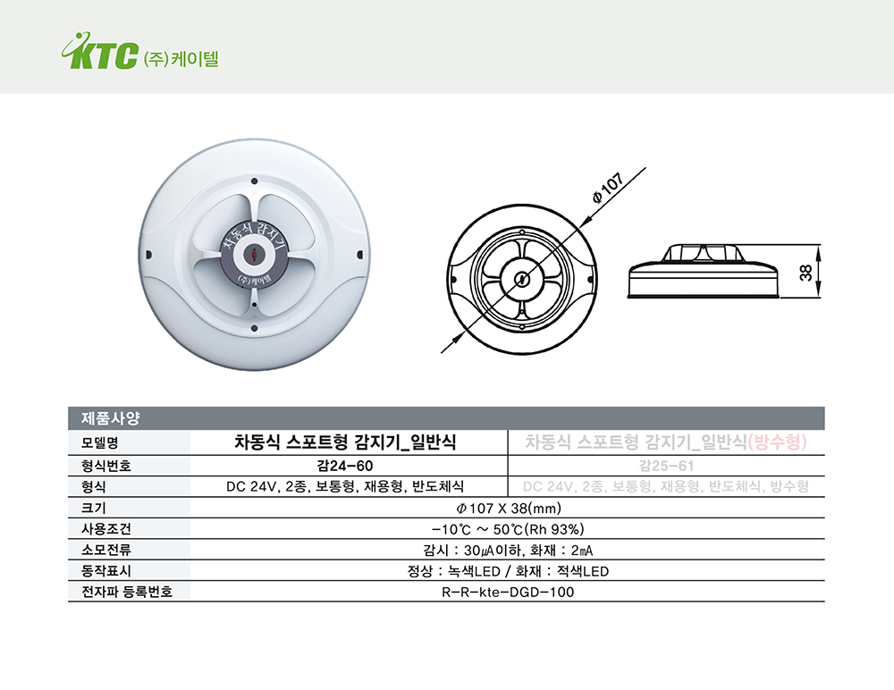 차동식 스포트형 감지기(일반식)/케이텔/비방수/감24-60/Ø107*38/개