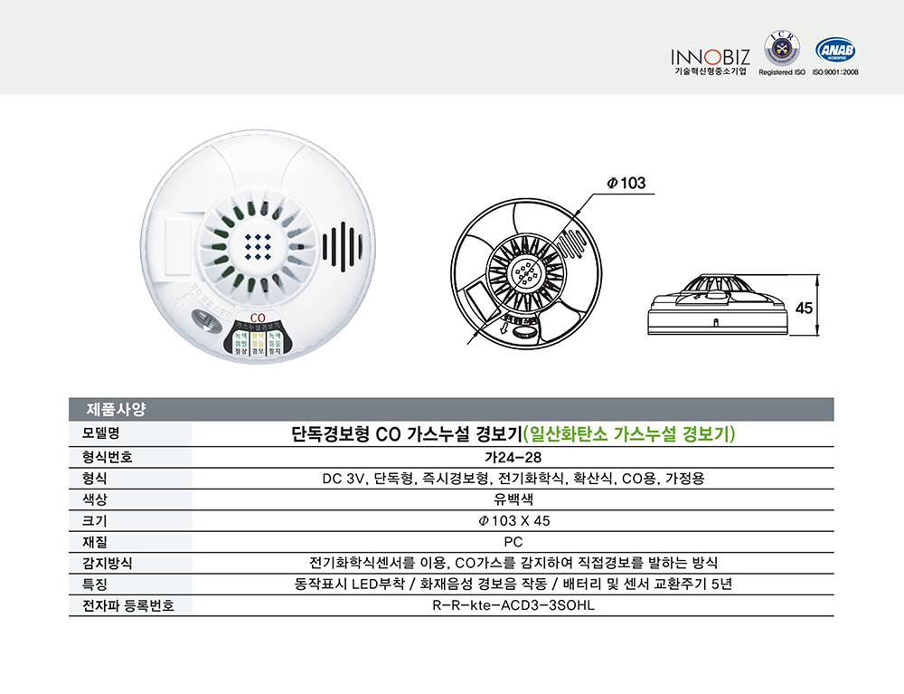 단독경보형 CO 가스누설 경보기(일산화탄소 가스누설 경보기)/케이텔/가24-28/가Ø103*45/개