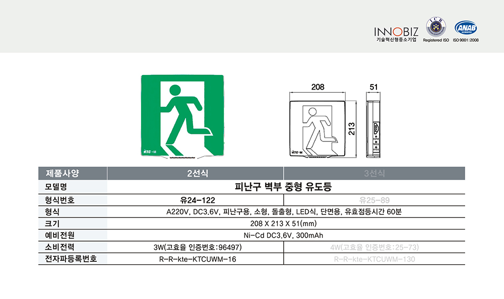 피난구 벽부 중형 유도등/2선식/케이텔/유24-122/208*213*51/개
