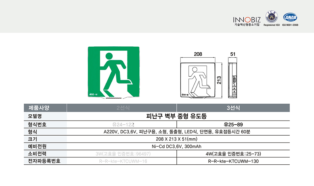 피난구 벽부 중형 유도등/3선식/케이텔/유25-89/208*213*51/개