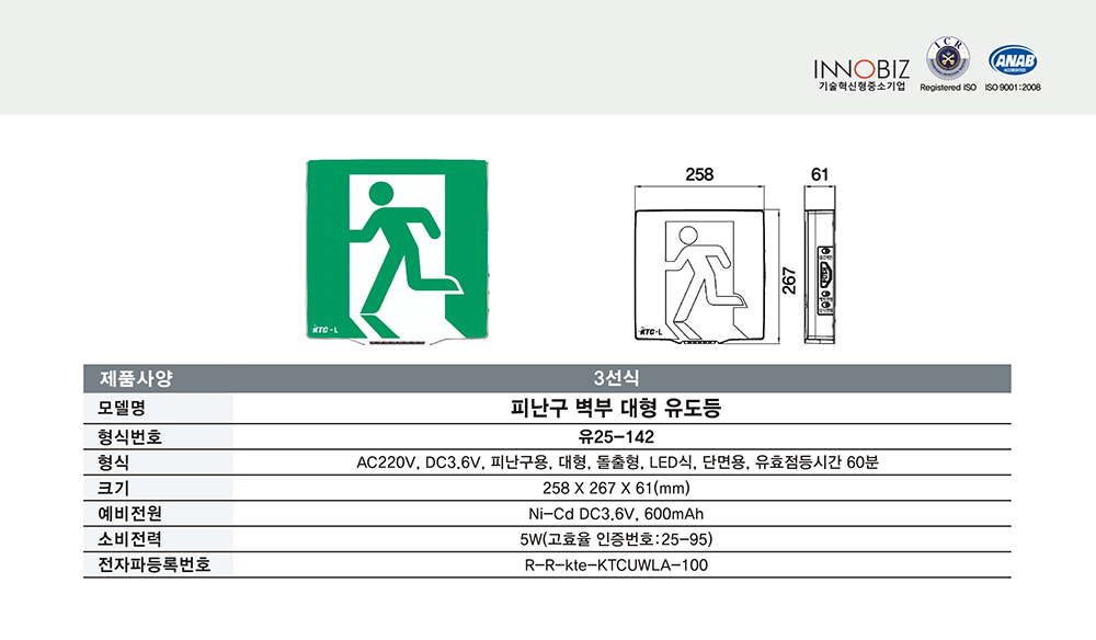 피난구 벽부 대형 유도등/3선식/케이텔/유25-142/258*267*61/개