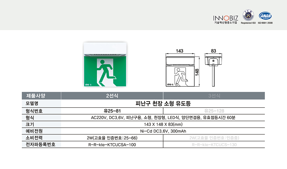 피난구 천장 소형 유도등/2선식/케이텔/유25-81/143*148*83/개