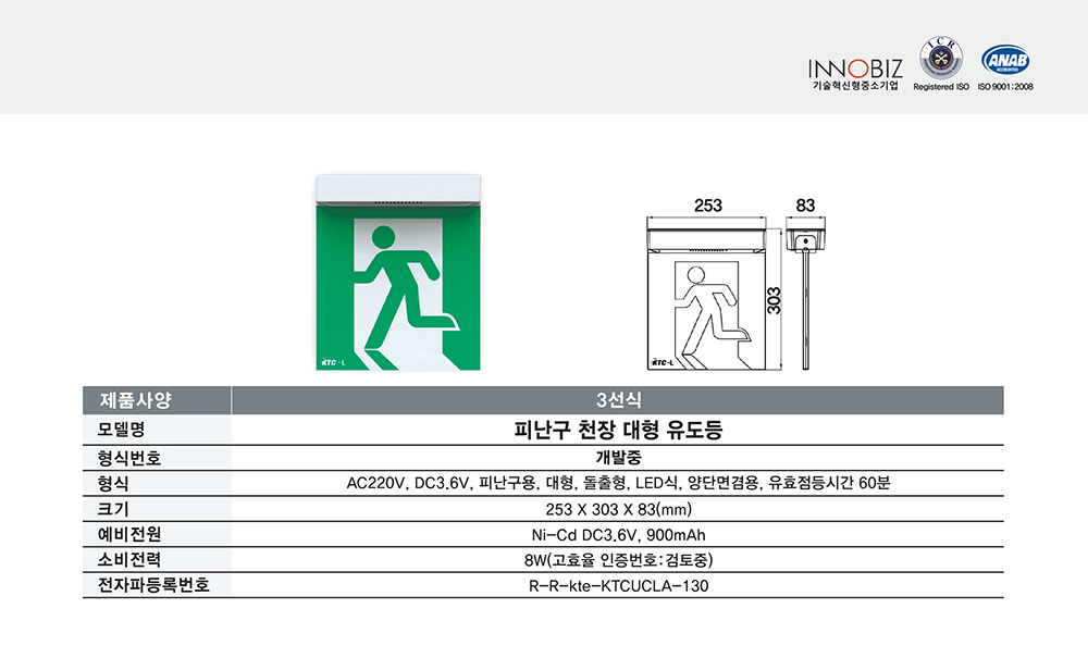 피난구 천장 대형 유도등/3선식/케이텔/개발중/253*303*83/개