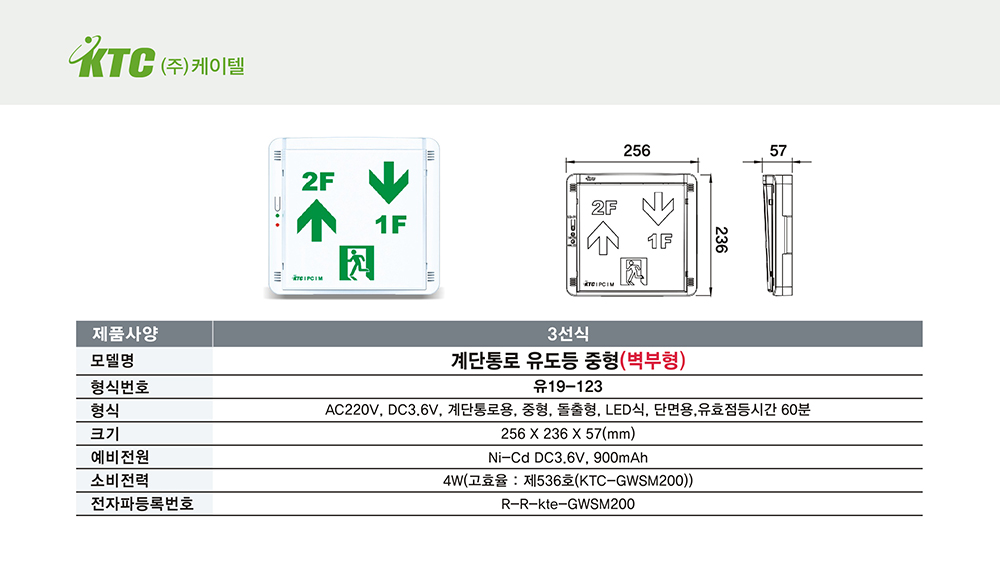 계단통로 유도등 중형(벽부형)/방향협의/3선식/케이텔/유19-123/256*236*57/개