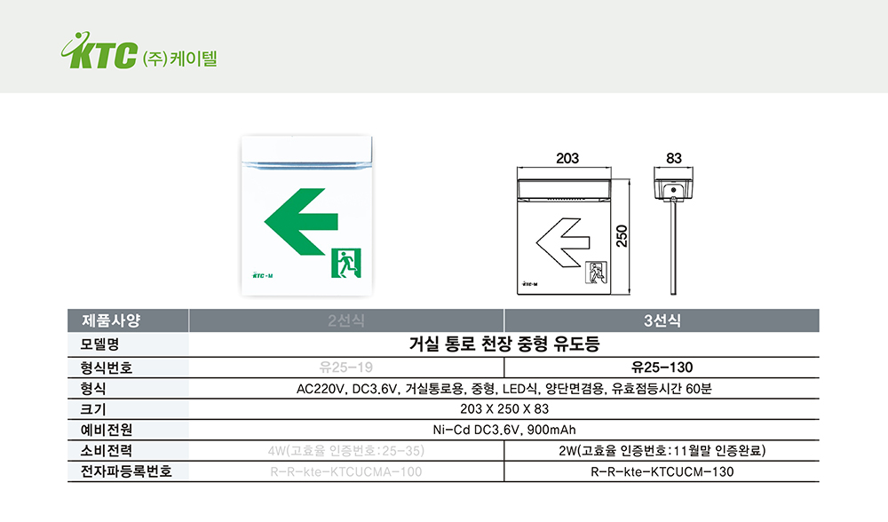 거실통로 천장 중형 유도등/3선식/케이텔/유25-130/203*250*83/개