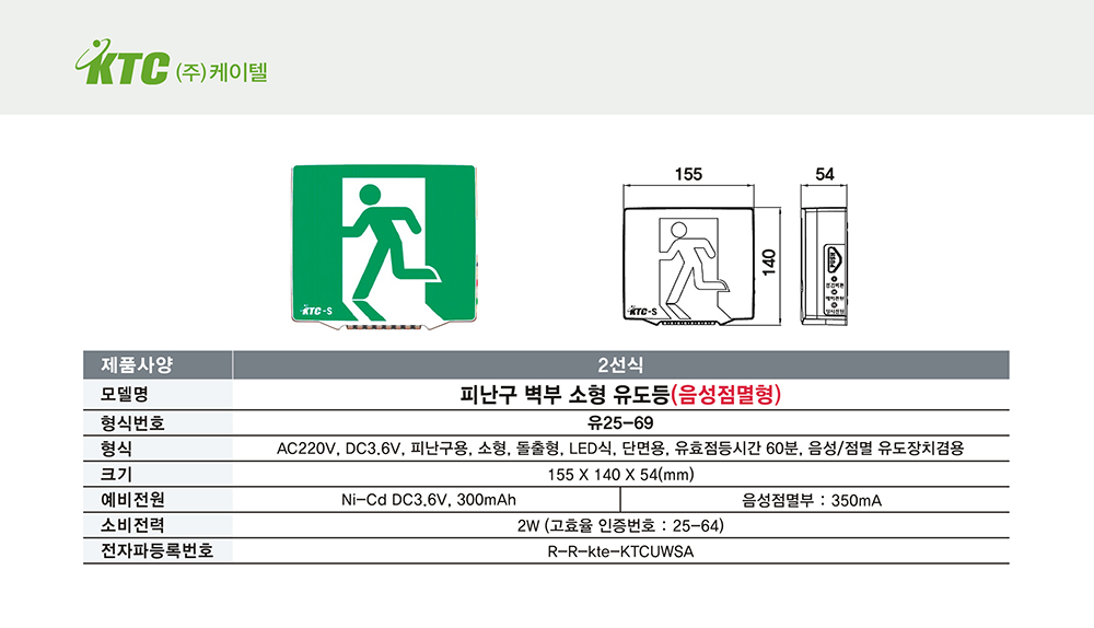 피난구 벽부 소형 유도등(음성점멸형)/2선식/케이텔/유25-69/155*140*54/개