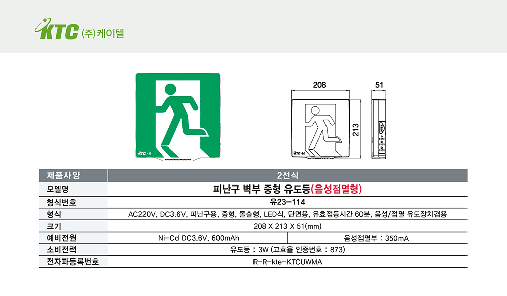 피난구 벽부 중형 유도등(음성점멸형)/2선식/케이텔/유23-114/208*213*51/개
