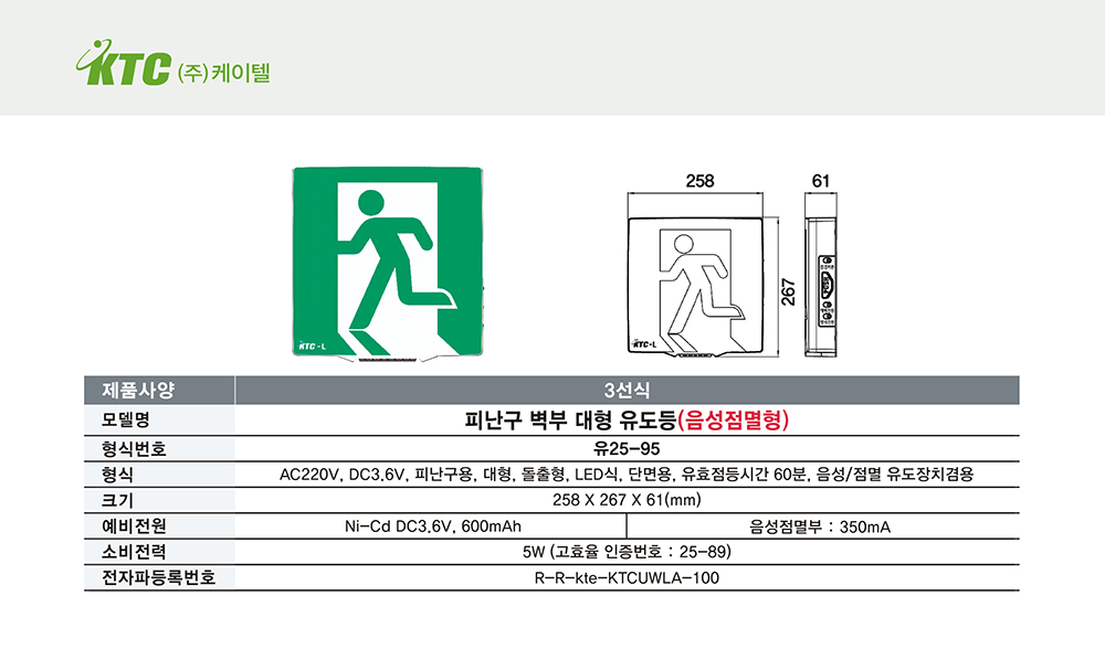 피난구 벽부 대형 유도등(음성점멸형)/3선식/케이텔/유25-95/258*267*61/개