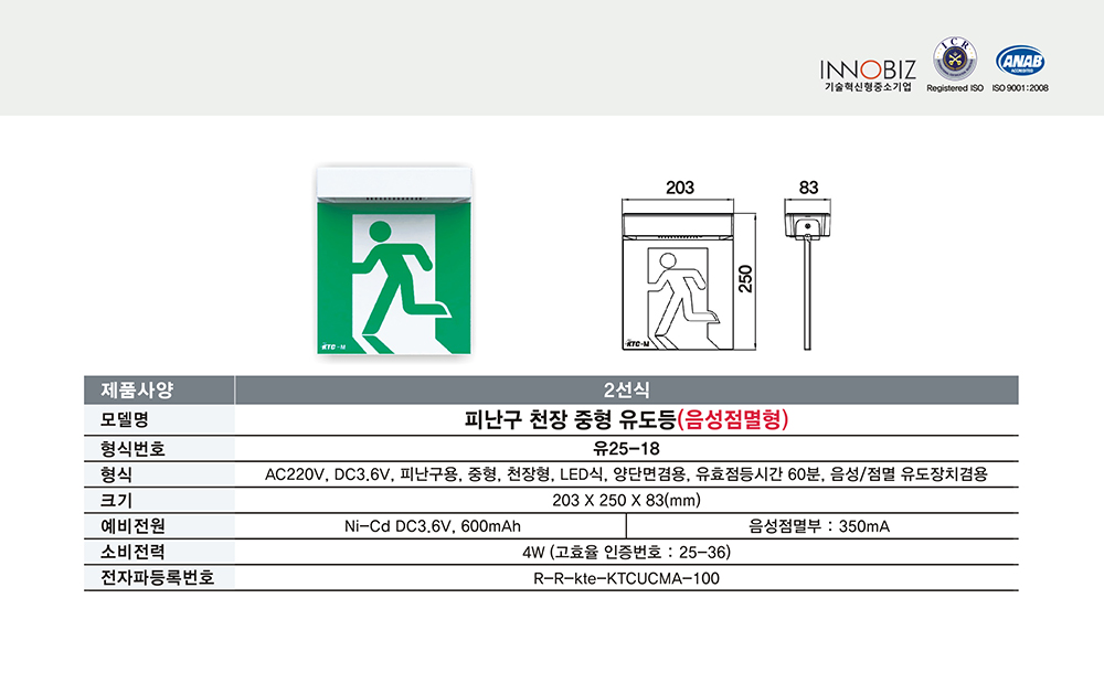 피난구 천장 중형 유도등(음성점멸형)/2선식/케이텔/유25-18/203*250*83/개